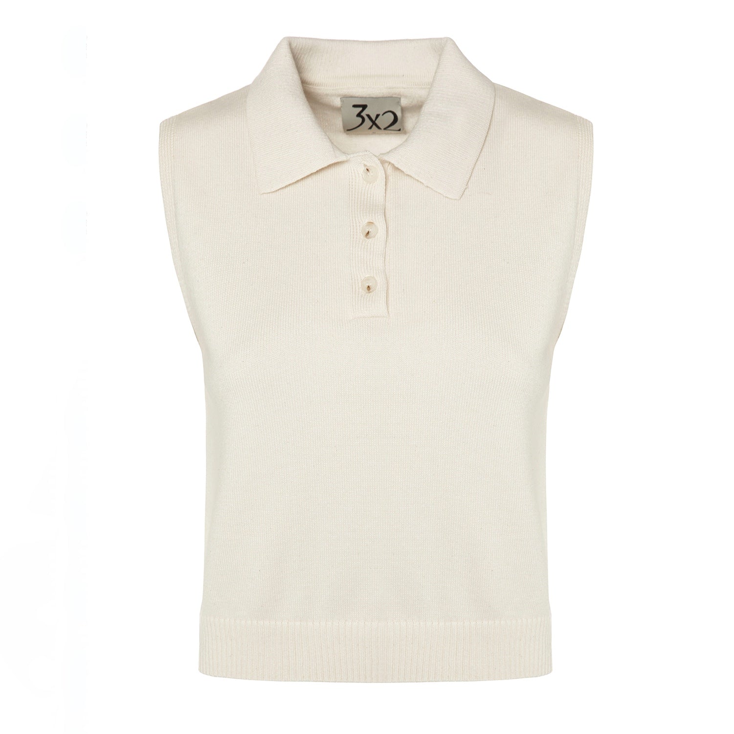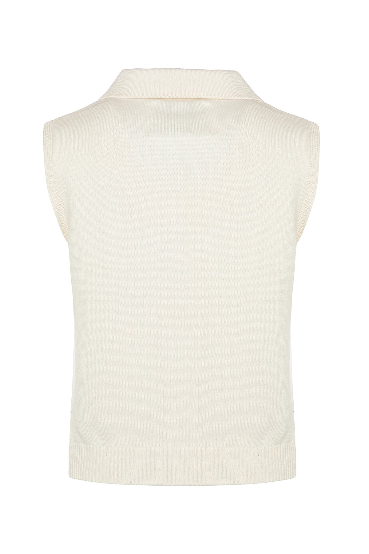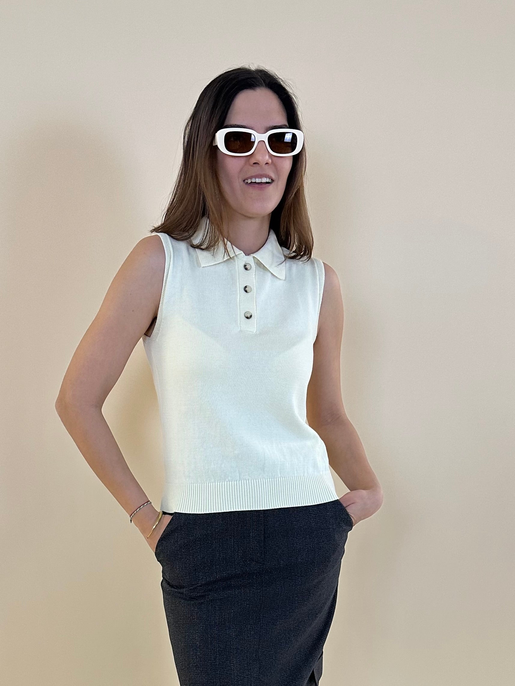 Kemik düğmeleri ile natürel görünümlü kolsuz polo yaka triko bahar günlerinin her ortama uygun anahtar parçası olmaya aday.