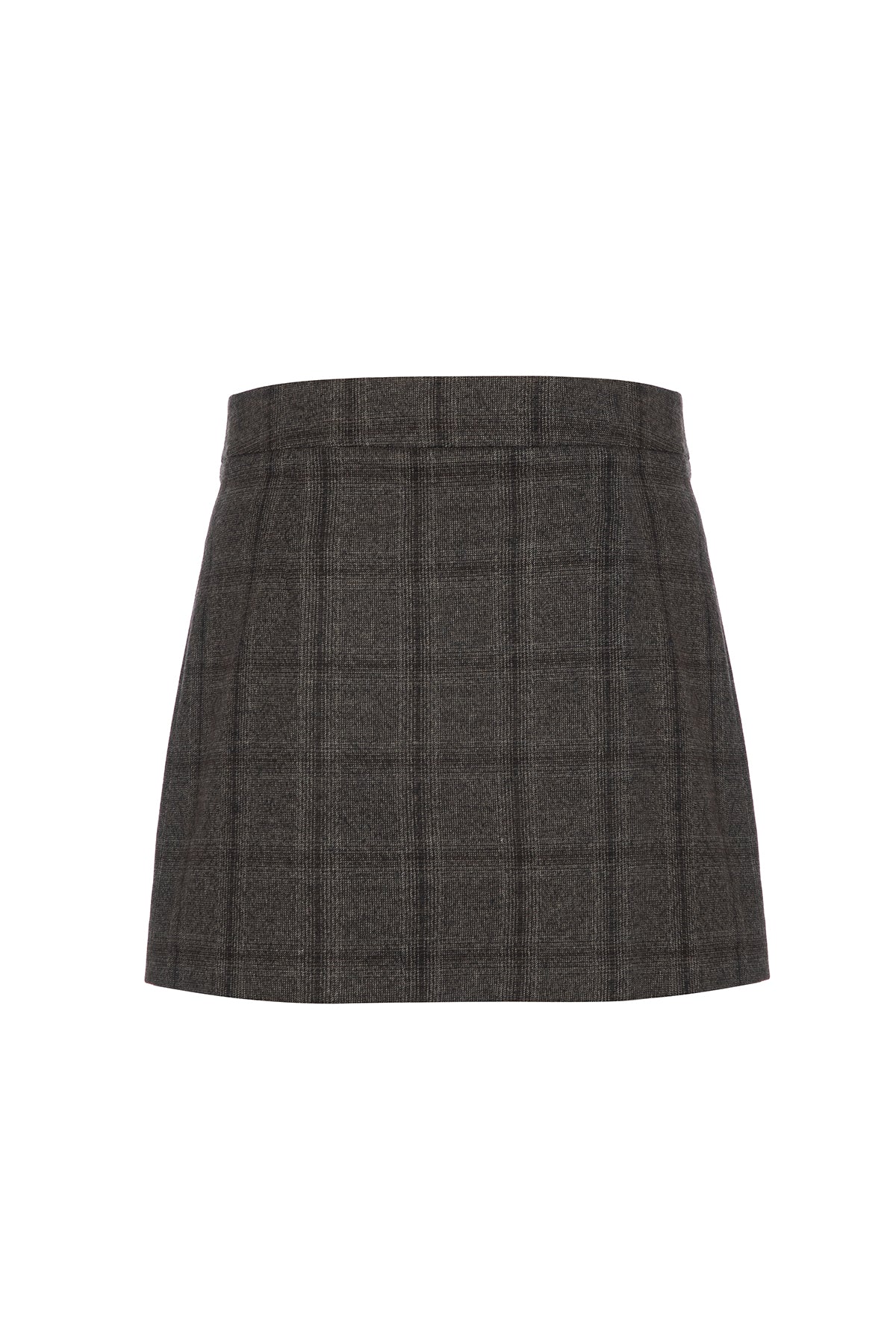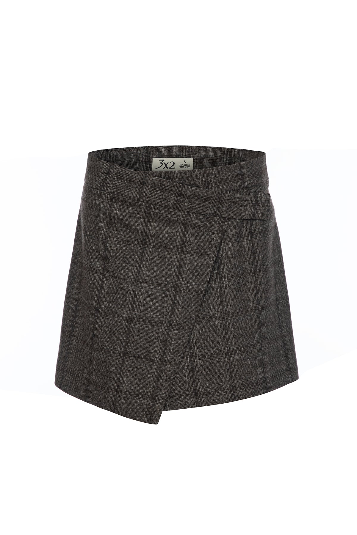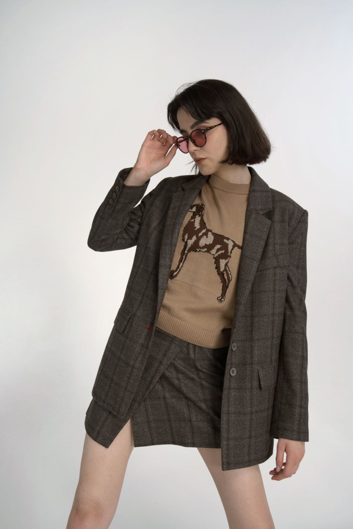 - Ekoseli kahverengi kumaştan, oversize blazer ile takım olacak şekilde,