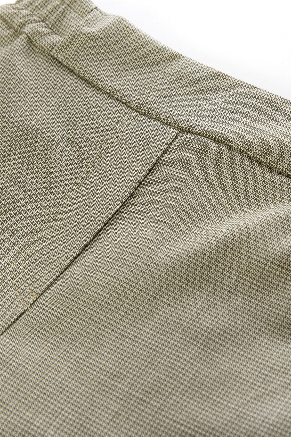 Mikro kazayağı desenlerle yeşil renk boru paça bu pantolon, lastikli beliyle rahat rahat otururken şık olmak isteyenler için 3x2 tarafından tasarlandı.