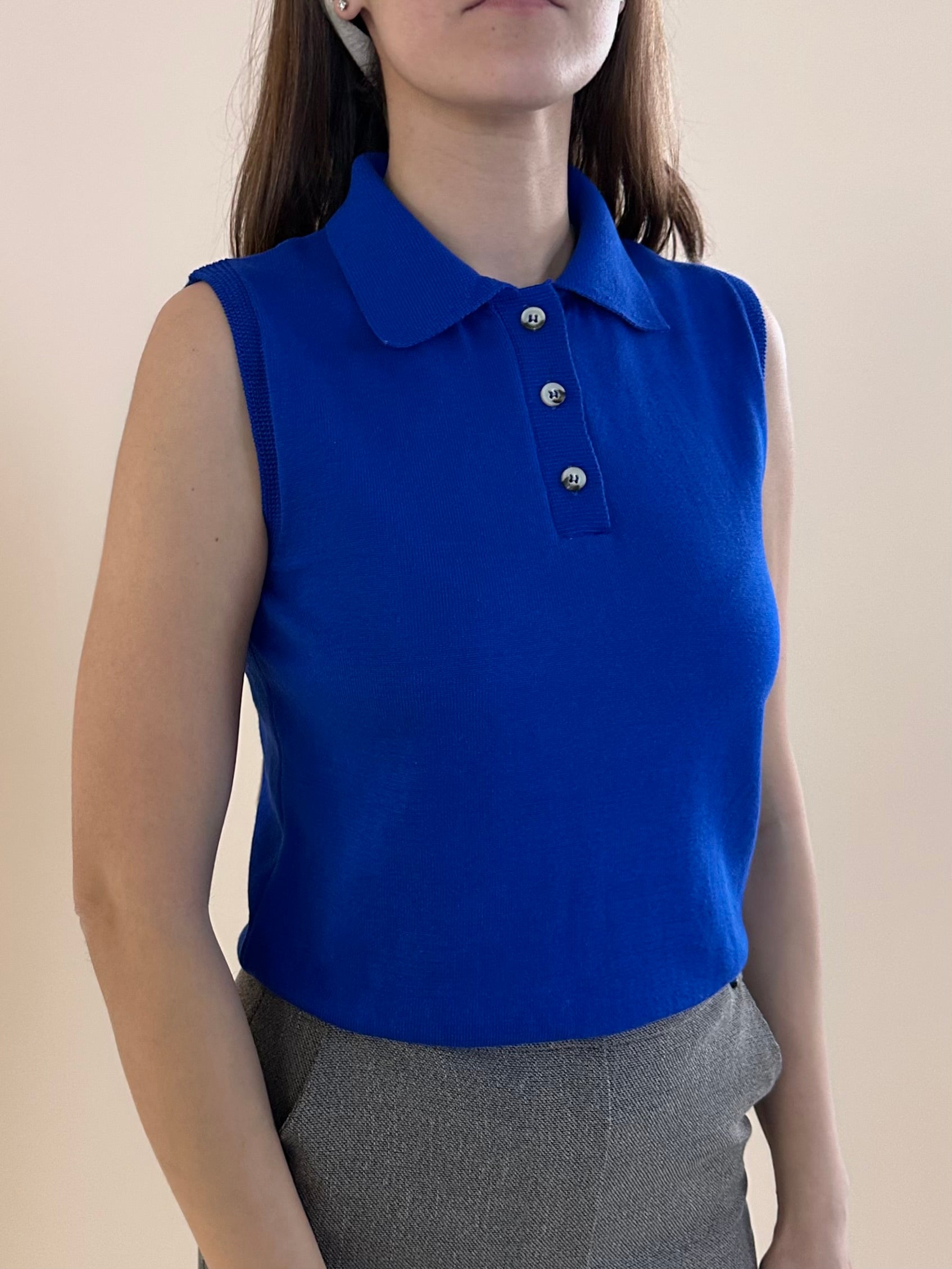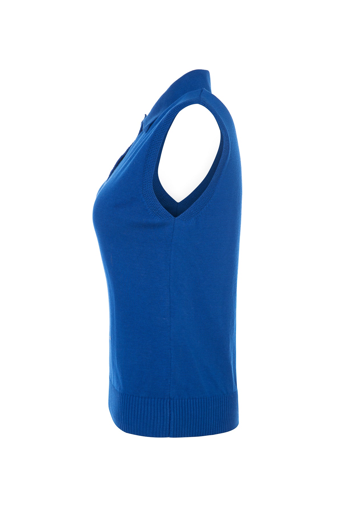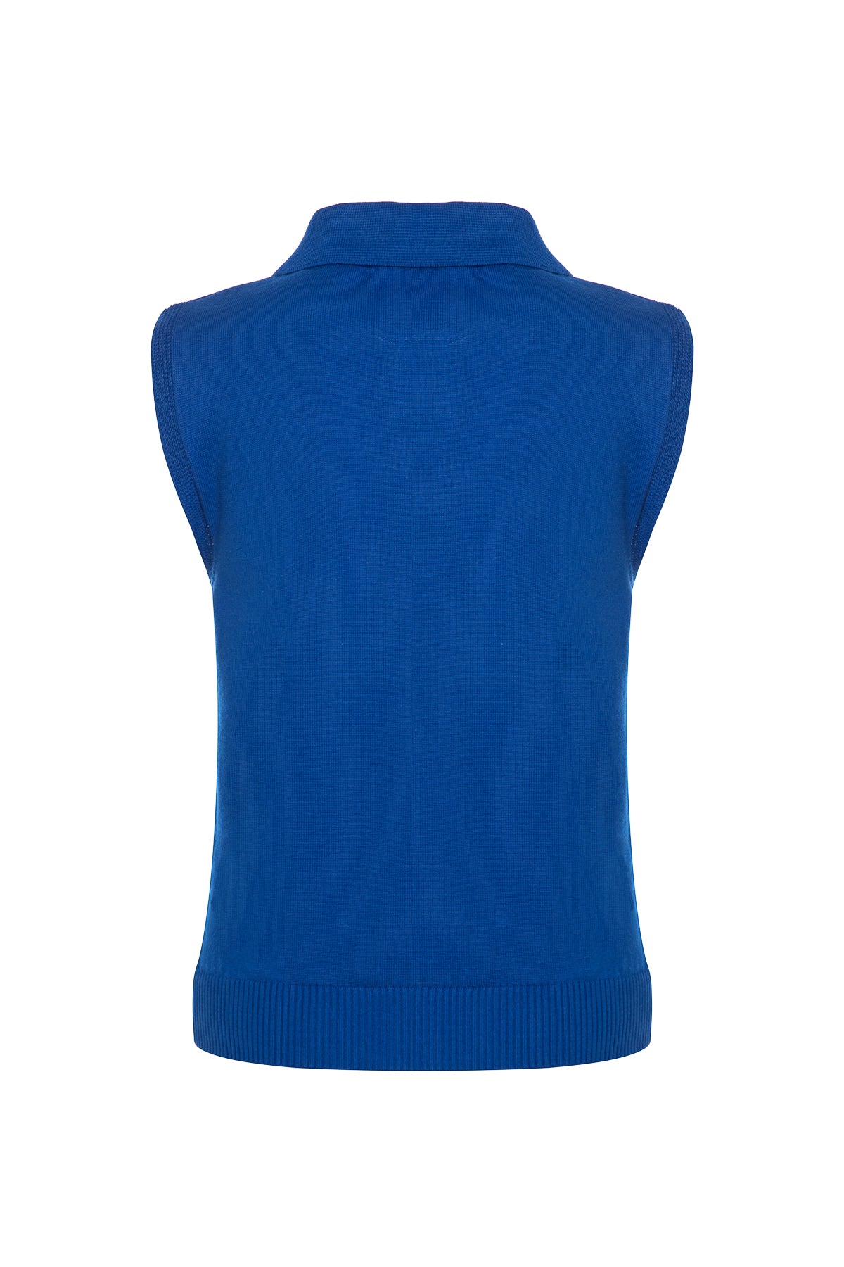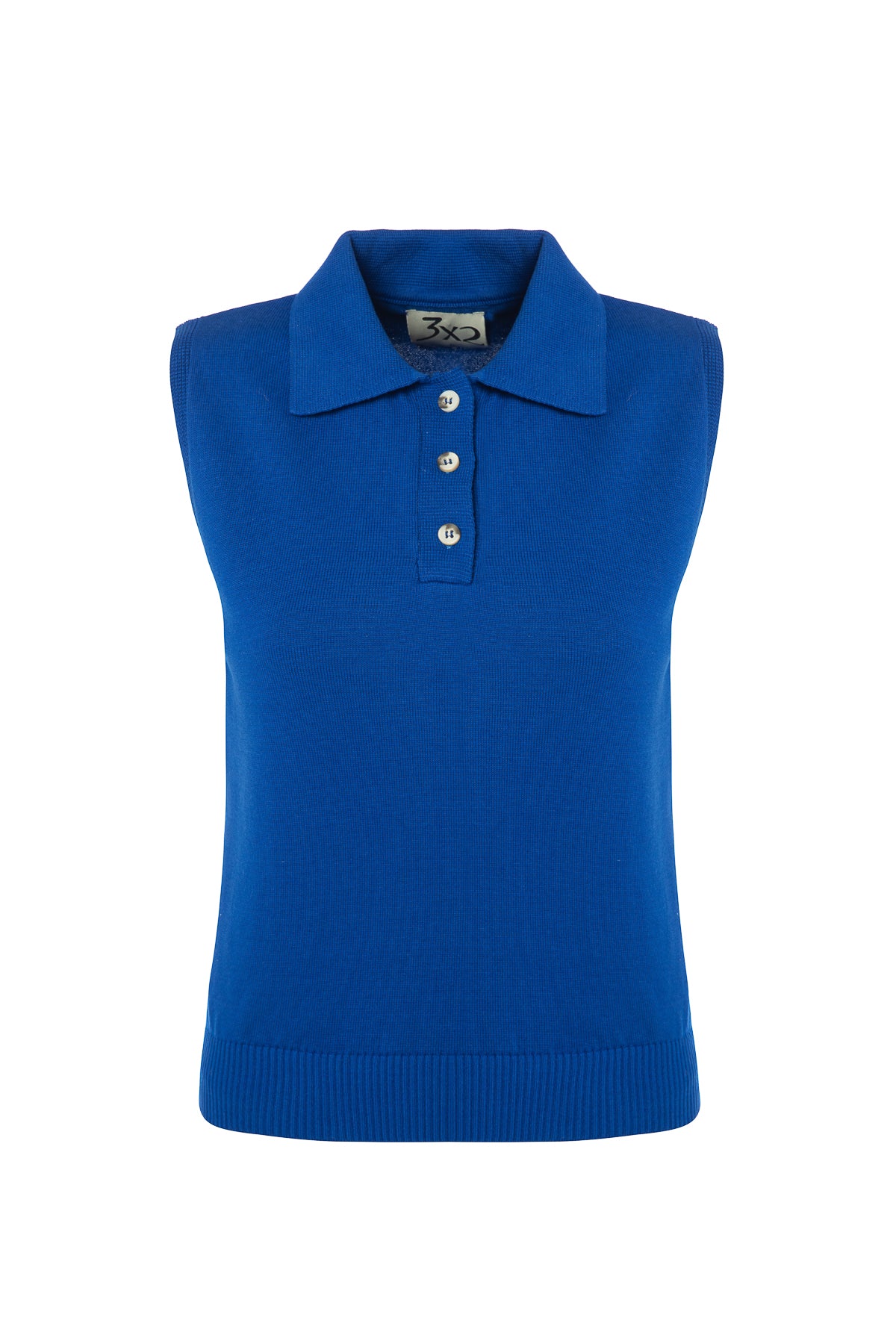 Kemik düğmeleri ile natürel görünümlü kolsuz polo yaka triko bahar günlerinin her ortama uygun anahtar parçası olmaya aday.