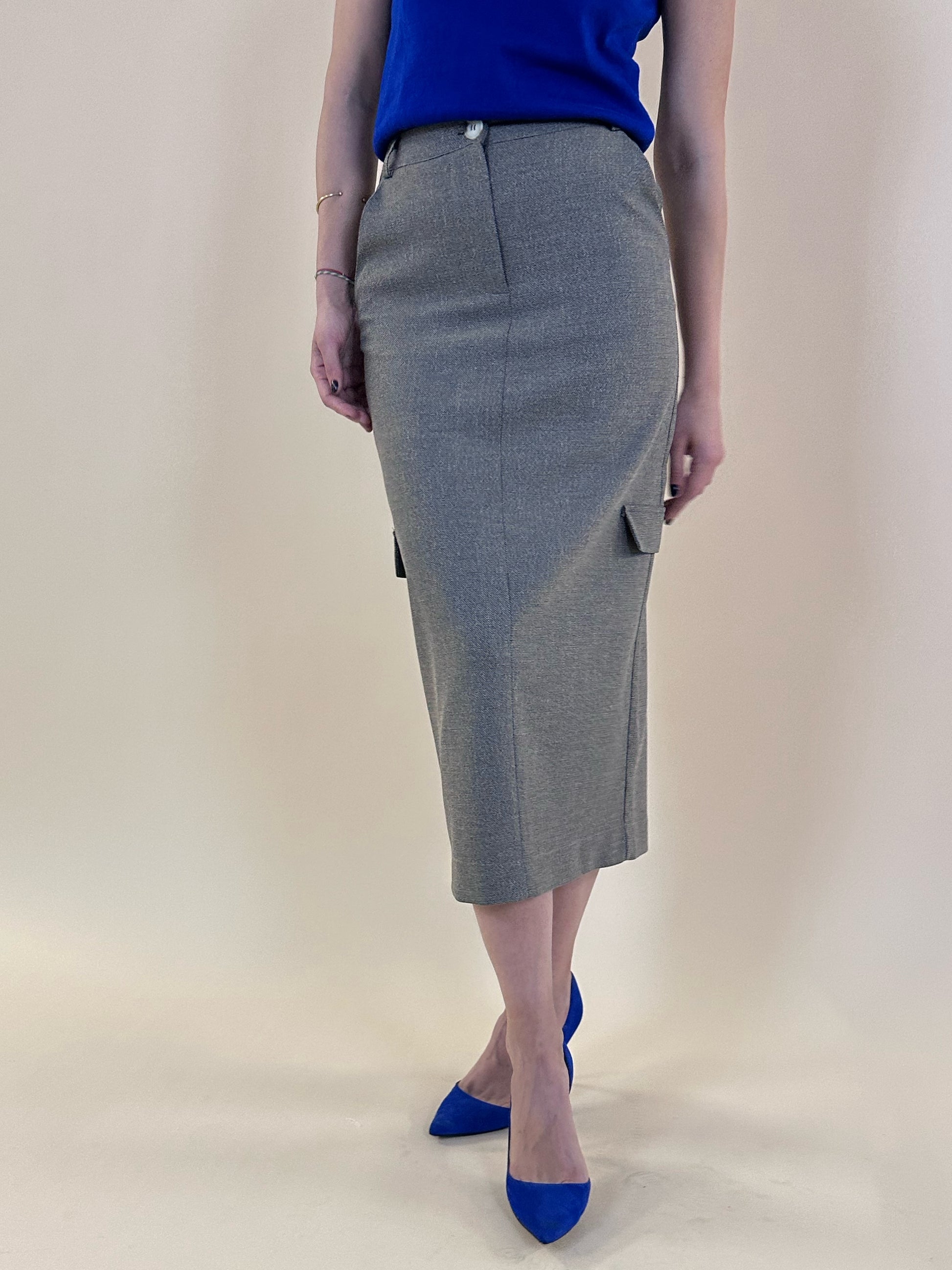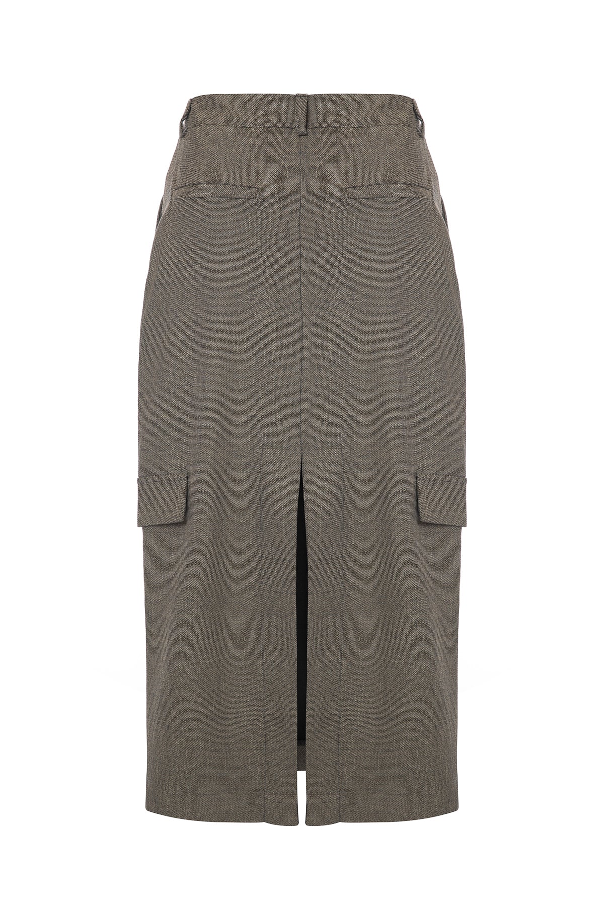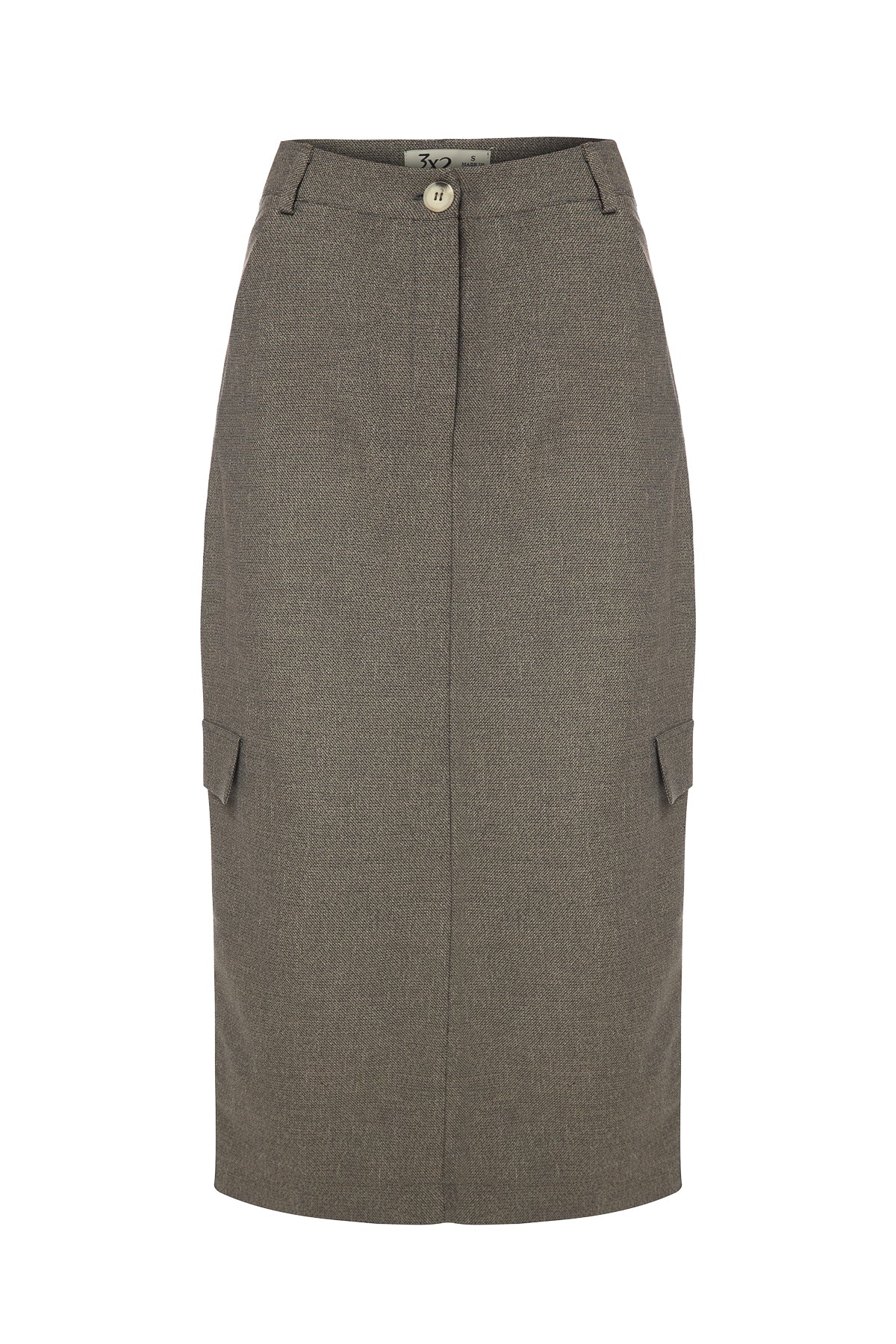 Tek düğme önden kapama fermuarlı midi boy cepli etek.